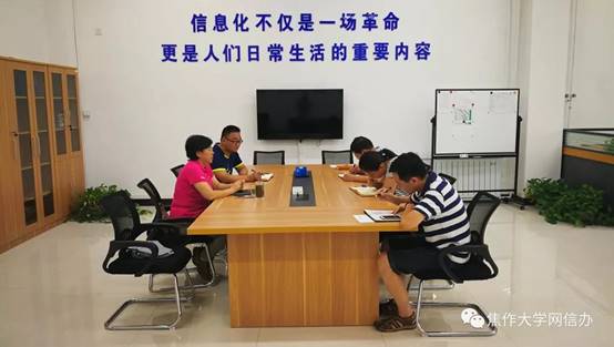 现场办公结束后,霍校长来到网信办,听取了网信办暑假期间的工作内容,并对下一阶段工作提出了要求。她要求,网信办全体人员要紧紧抓住暑假施工的有利时机,精心组织、倒排工期、加强调度、快速推进建设进度。同时,要确保质量、确保安全,扎实推进项目取得新成绩。